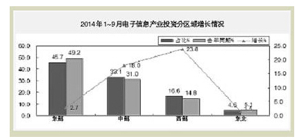 2014年1~9月,電子信息產業固定資產投資持續呈趨緩態勢,電子器件行業投資持續回落,家用視聽和信息材料等領域投資仍下滑,電子元件、計算機和通信行業投資增速放緩,新開工項目依然不足。主要特點如下: