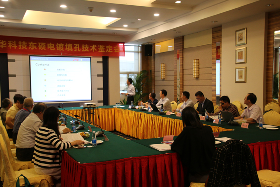 鑒定會議由林金堵教授主持,光華科技董事副總裁鄭韌先生,東碩科技楊應喜總經(jīng)理、劉彬云總監(jiān)等出席了鑒定會。會議過程中,劉彬云總監(jiān)首先介紹了東碩電鍍填孔技術(shù),該技術(shù)屬東碩科技的創(chuàng)新自主研發(fā),于2013年1月立項,目前已成功完成產(chǎn)品的預研、小試、中試、以及客試階段測試,測試結(jié)果表明本項目研發(fā)出的新產(chǎn)品可用于盲孔的電鍍填充過程,能實現(xiàn)盲孔有效、快速的填充,且性能穩(wěn)定,值得推廣和應用。