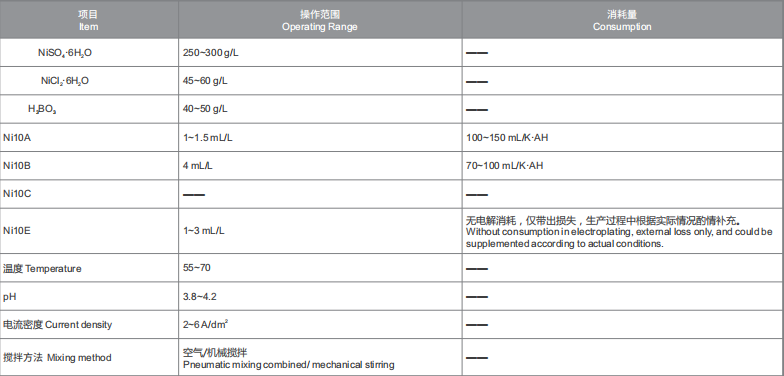 Ni10C:電位差調節劑,當鍍液受到污染,添加Ni10A不能獲得滿意的電位差時,可加入電位差調節劑Ni10C,提高電位差,建議每次添加0.1~0.3mL/L;<br />