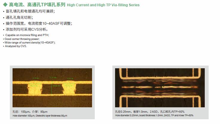 VFP系列是我司新一代填孔藥水,其中VFP08適用于不溶性陽極電鍍填孔,VFP08S適用于可溶性陽極電鍍填孔,均可用于孔徑2~6mil的盲孔填孔,且可達到較薄面銅,適應(yīng)精細線路的生產(chǎn),VFP21適用于盲孔填孔和通孔同時電鍍。